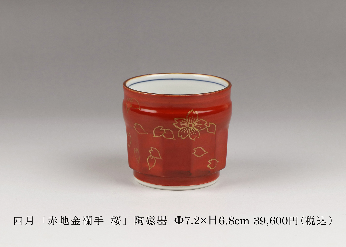 初代から伝わる赤に、金泥で描かれた桜が華やかな金襴手の湯碗。