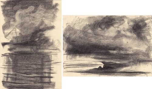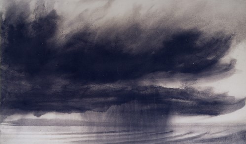 How could I express this overwhelmingly deep red? My body felt that no shade of red would ever completely express its depths. Basically I used charcoal for sketching ‒ because clouds are forever changing and charcoal allows quick drawing to capture their forms ‒ and at that time, looking at my colorless charcoal sketches, I had an idea that monotone makes it possible to grasp the scene I felt with my heart and all five senses, and not just the things captured only by my eyes.