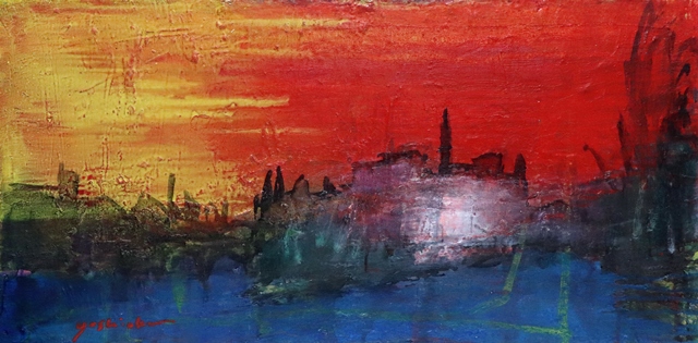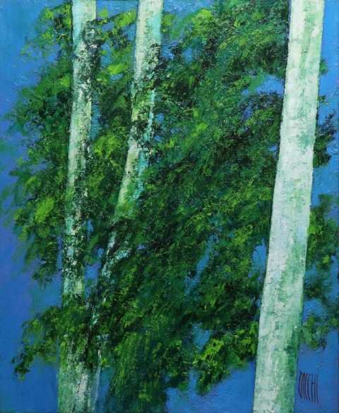 透明感のある鮮やかな色彩を、ペインティングナイフで大胆に重ね、爽快感と喜びに満ち溢れた世界を築き上げる